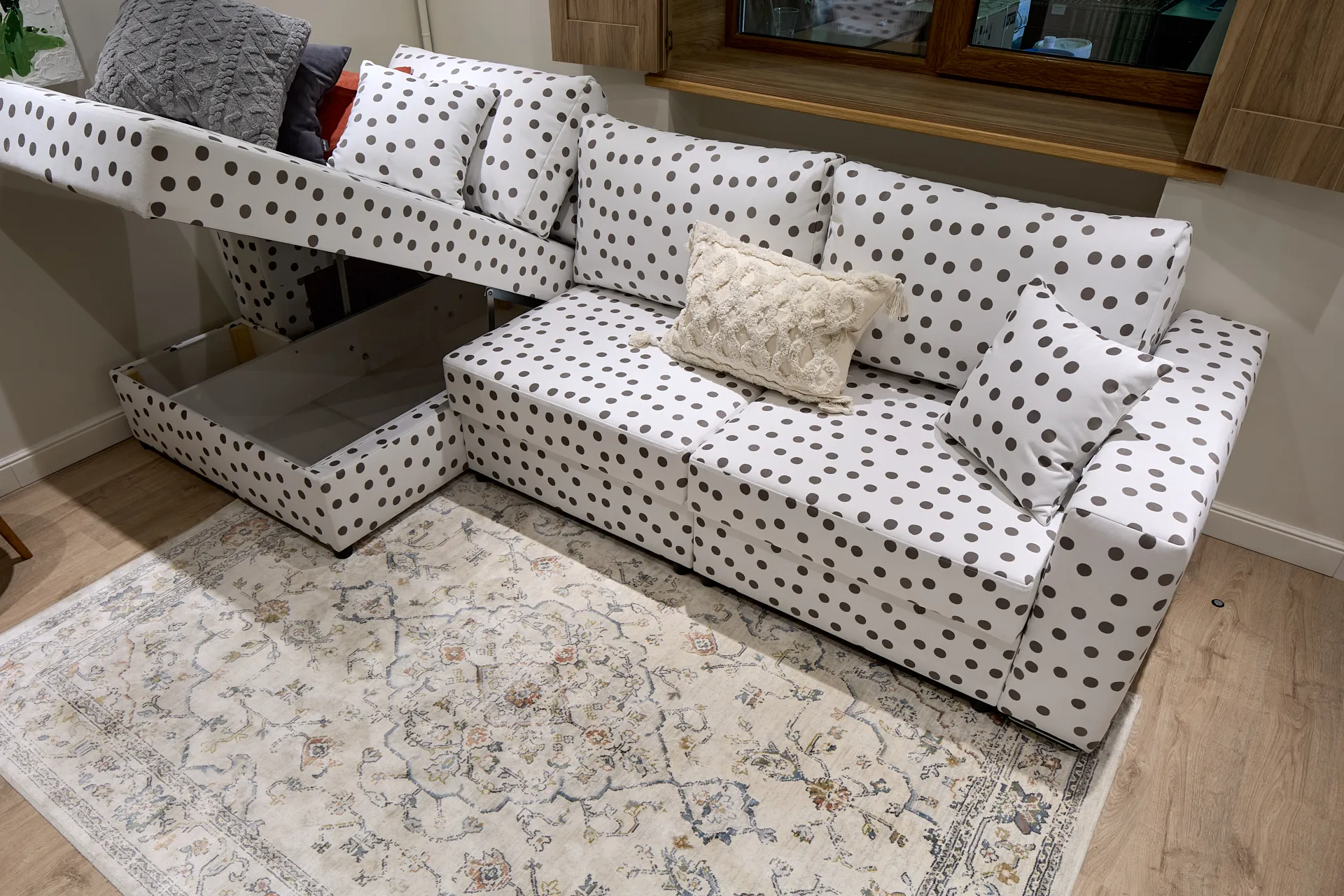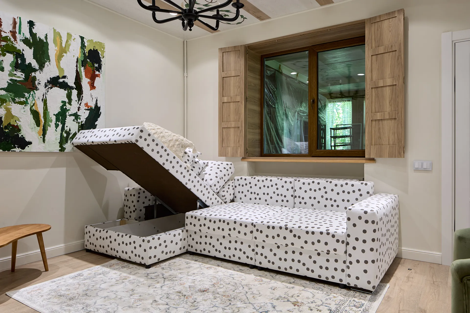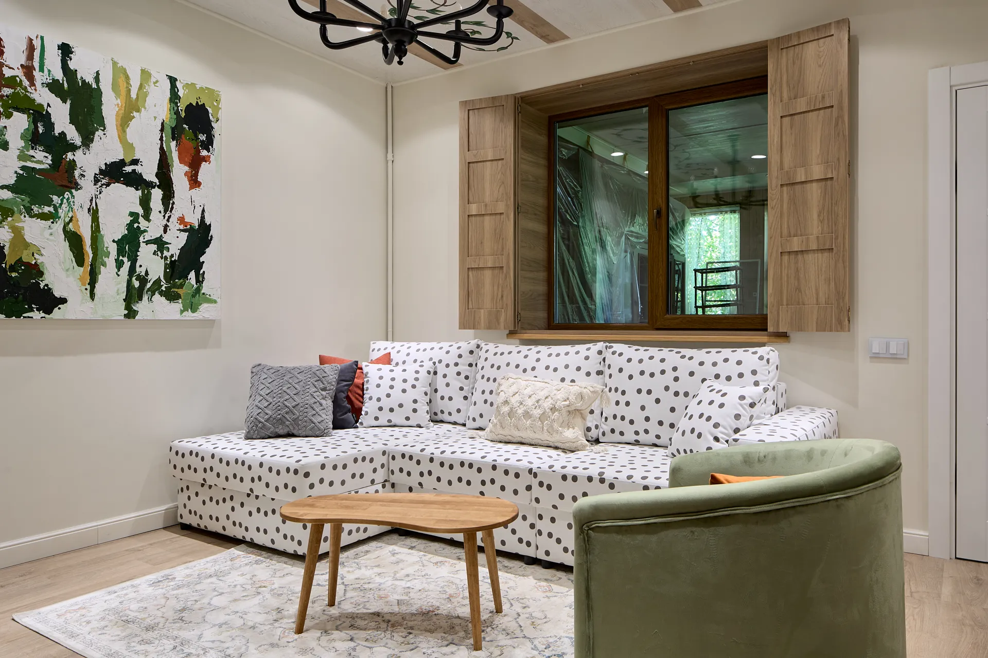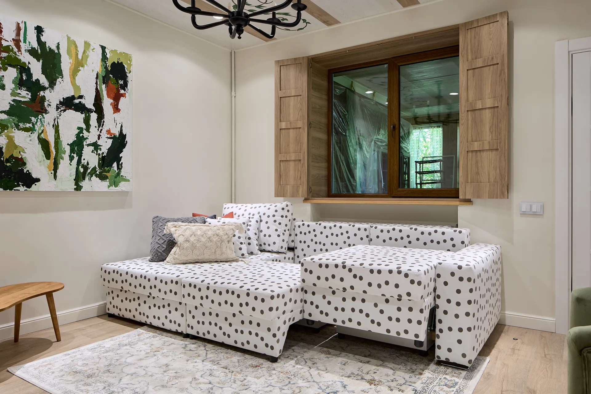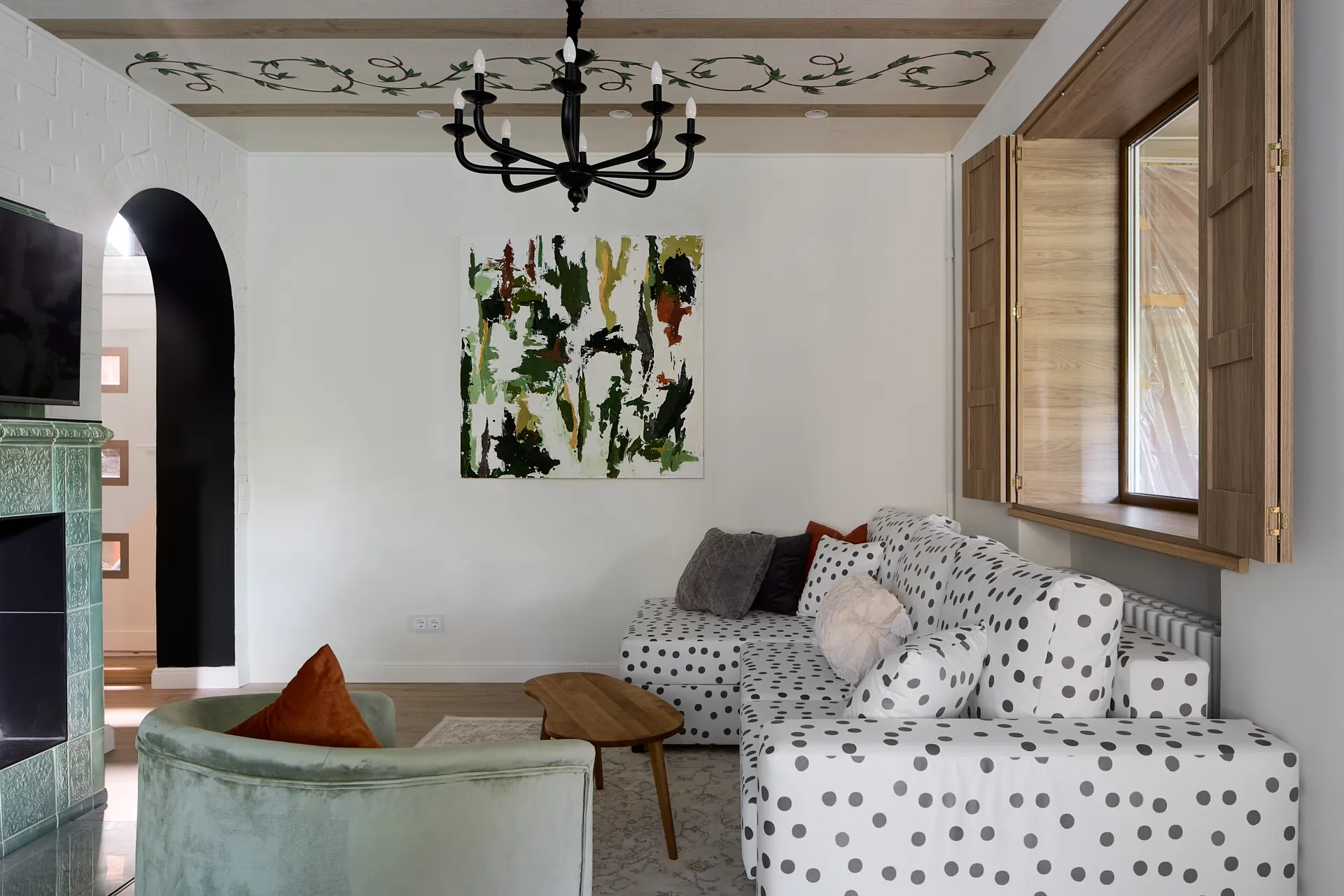 Обновление гостиной стало для героев приятным подарком, который им решила сделать сестра Дмитрия. Источником вдохновения при создании интерьера стали кованые цветы, которые украшают решетку камина героев передачи. И важной частью гостиной, естественно, стал удобный диван в обивке в горошек, как элемент деревенского стиля в современном загородном пространстве.
