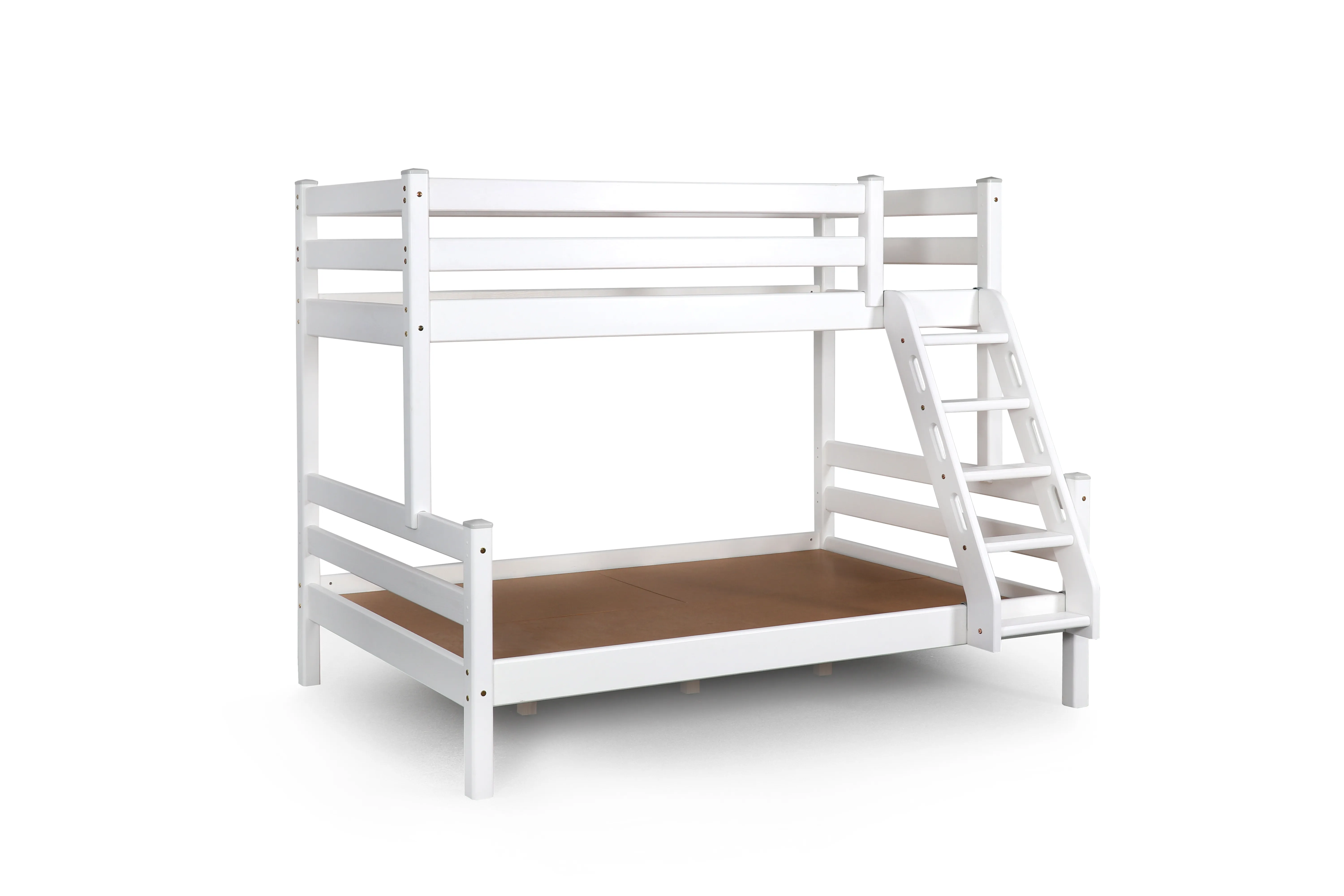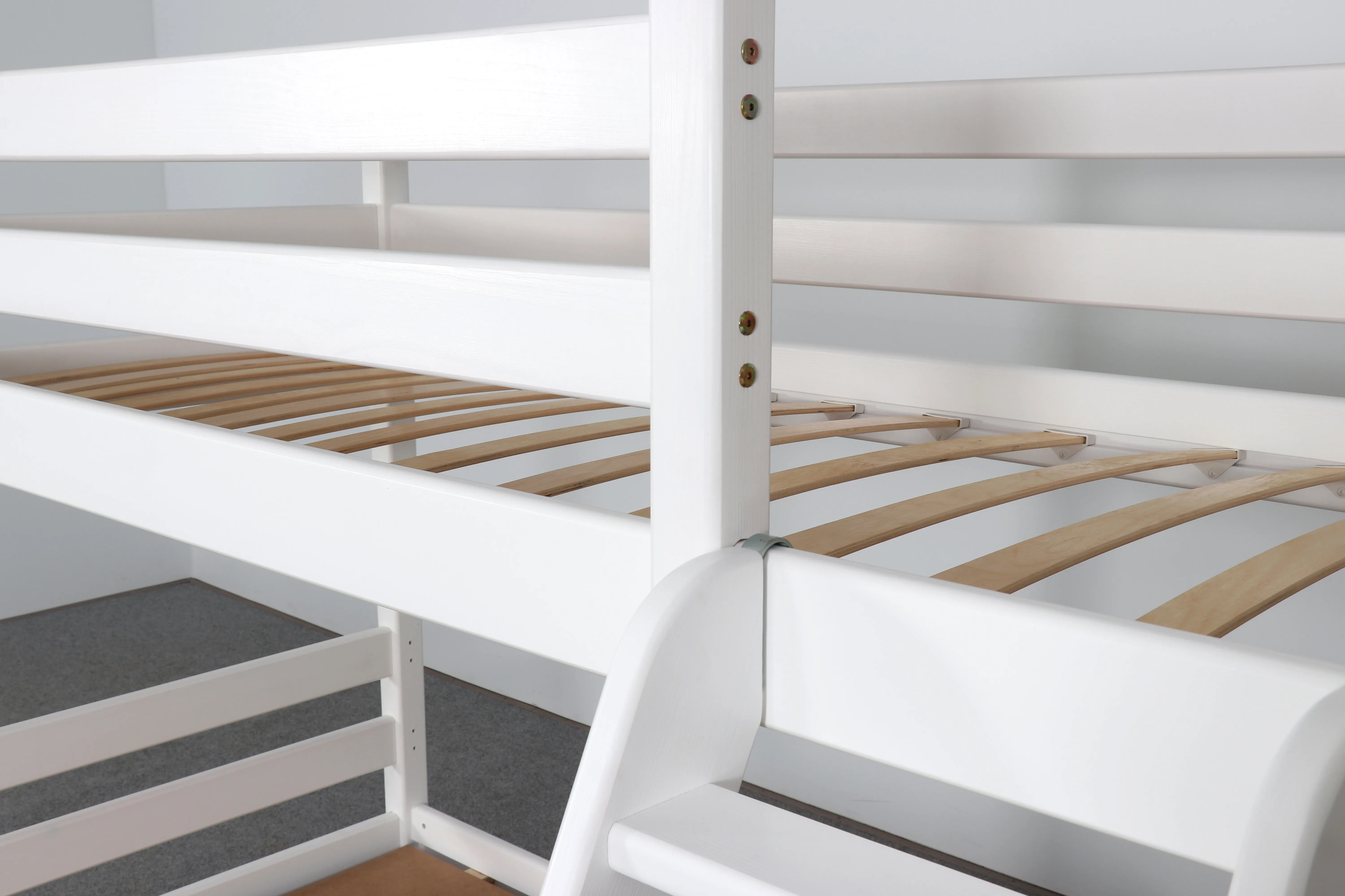 Увеличенное до 120 см по ширине спальное место нижнего яруса подходит для подростка, чей вес не превышает 70 кг. Верхнее основание имеет вид гнутых ламелей, с усиливающей перемычкой по периметру, нижнее представлено опорными брусками с уложенным поверх них настилом из шлифованного МДФ 10мм. Массив сосны подвергнут тщательной шлифовке и покрыт безопасным лаком на водной основе.