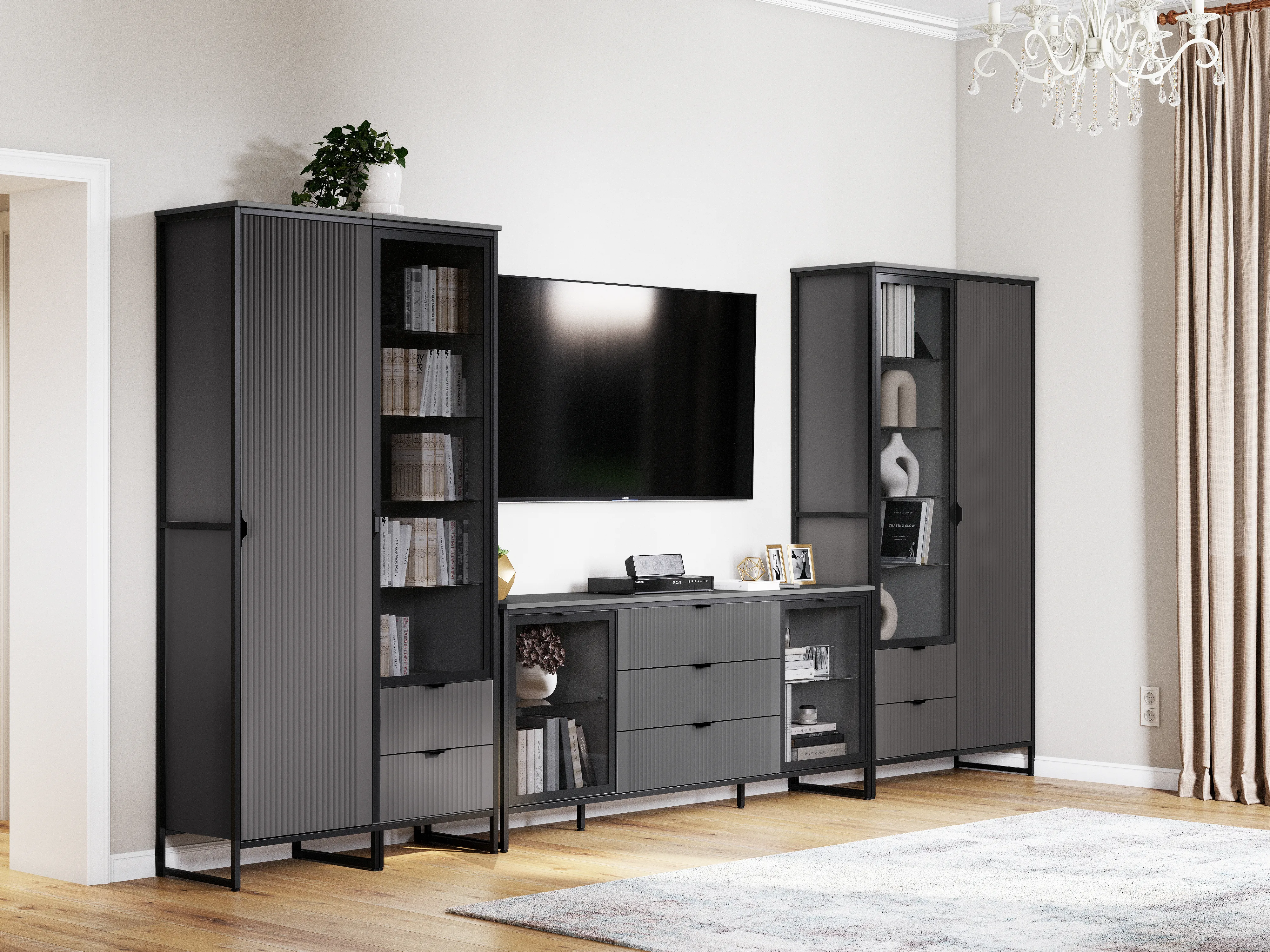 Коллекция модульной гостиной "Нора" - современный оригинальный стиль. Декоративная продольная фрезеровка на МДФ фасадах и опоры на металлокаркасе соответствуют модным тенденциям этого года в ведущих зарубежных коллекциях. Дизайн коллекции гармонирует со стилем минимализм и лофт.
