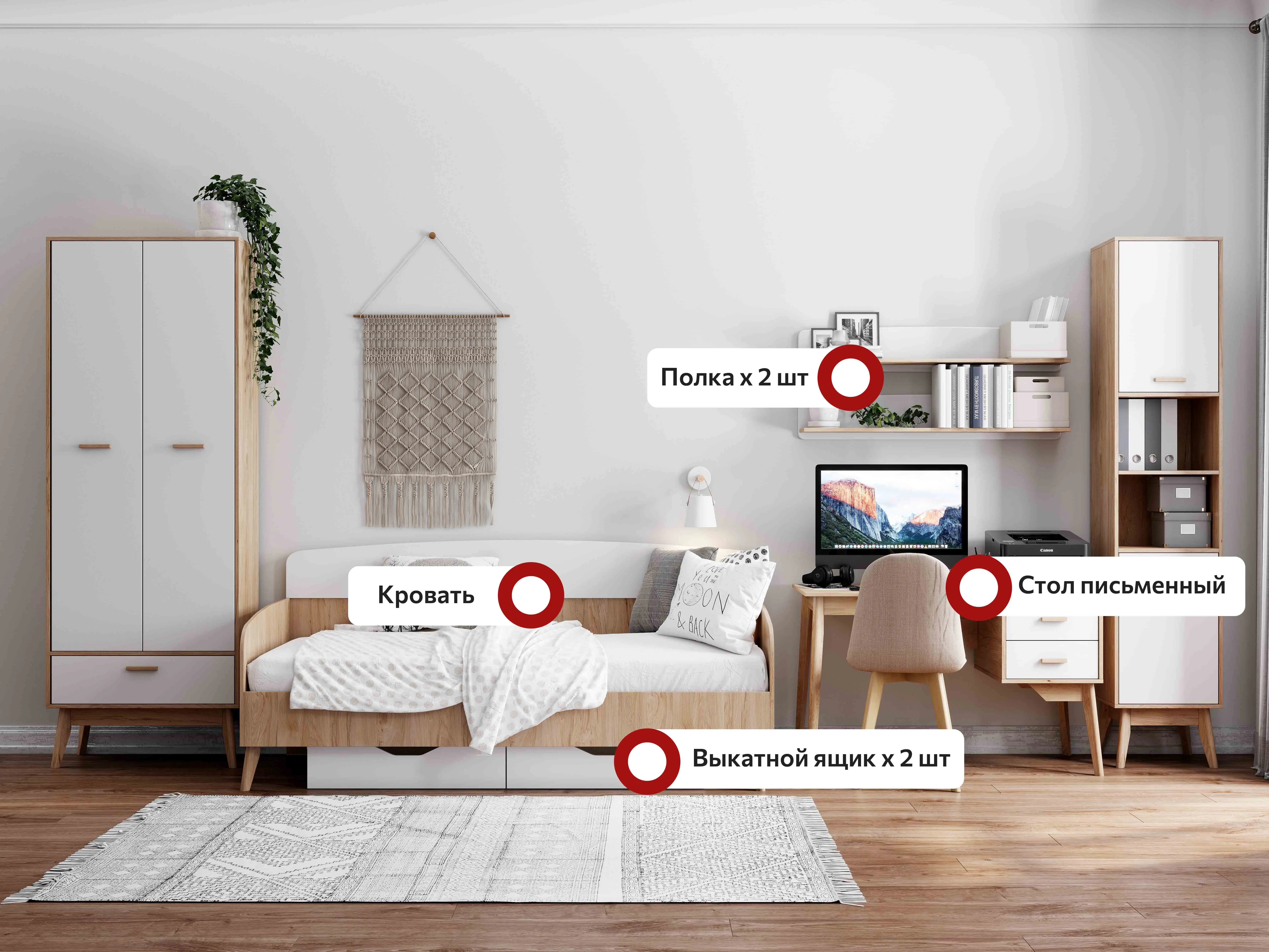 Она включает в себя различные элементы: шкаф, стол, стеллаж и кровать, которые можно комбинировать в зависимости от потребностей и предпочтений.