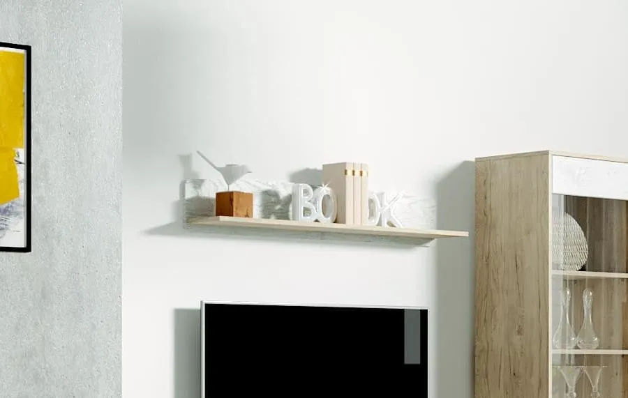 Навесная полка "Калгари" поможет визуально связать воедино элементы мебельной композиции Калгари в ТВ-зоне гостиной. Конструкция состоит из собственно полки из ЛДСП цвета натурального дуба и задней планки из белоснежного МДФ, имеющей скругленные контуры.