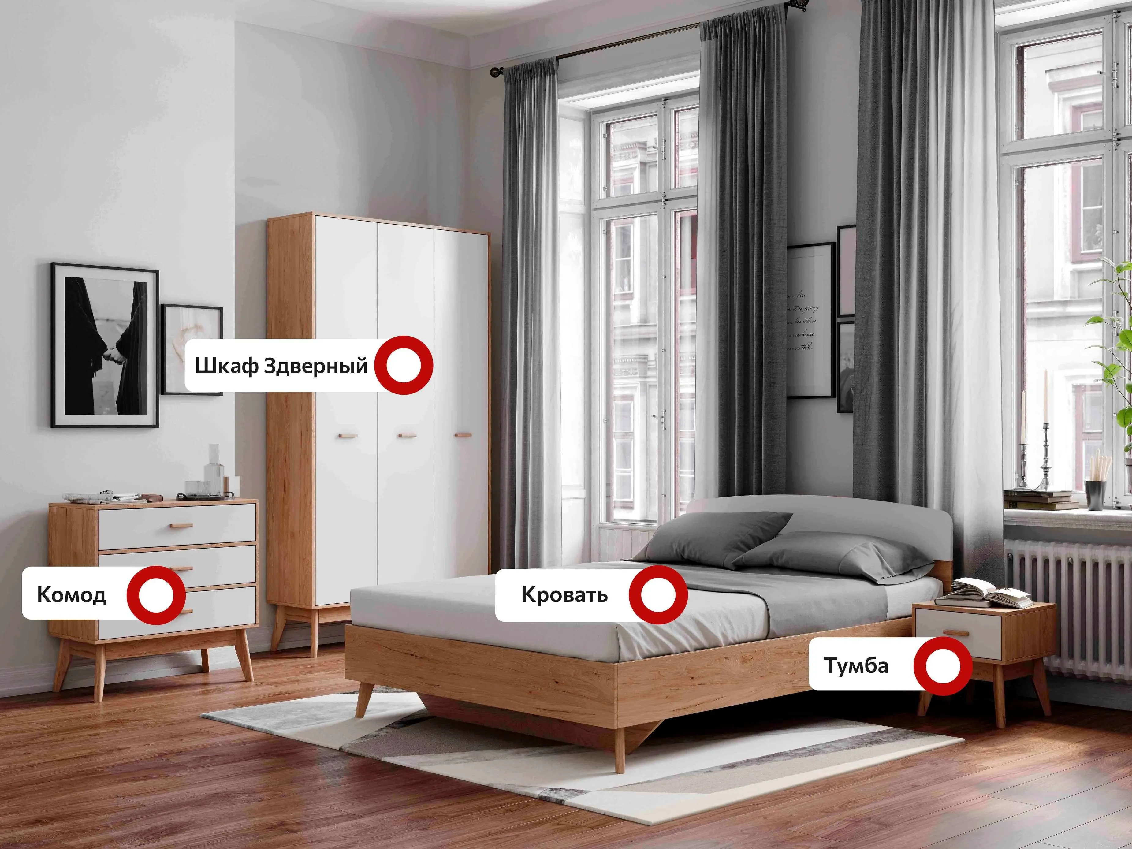 Гарнитур подходит как для просторных, так и для небольших спален, помогая эффективно использовать пространство и создавать уютное и светлое место для отдыха и сна.