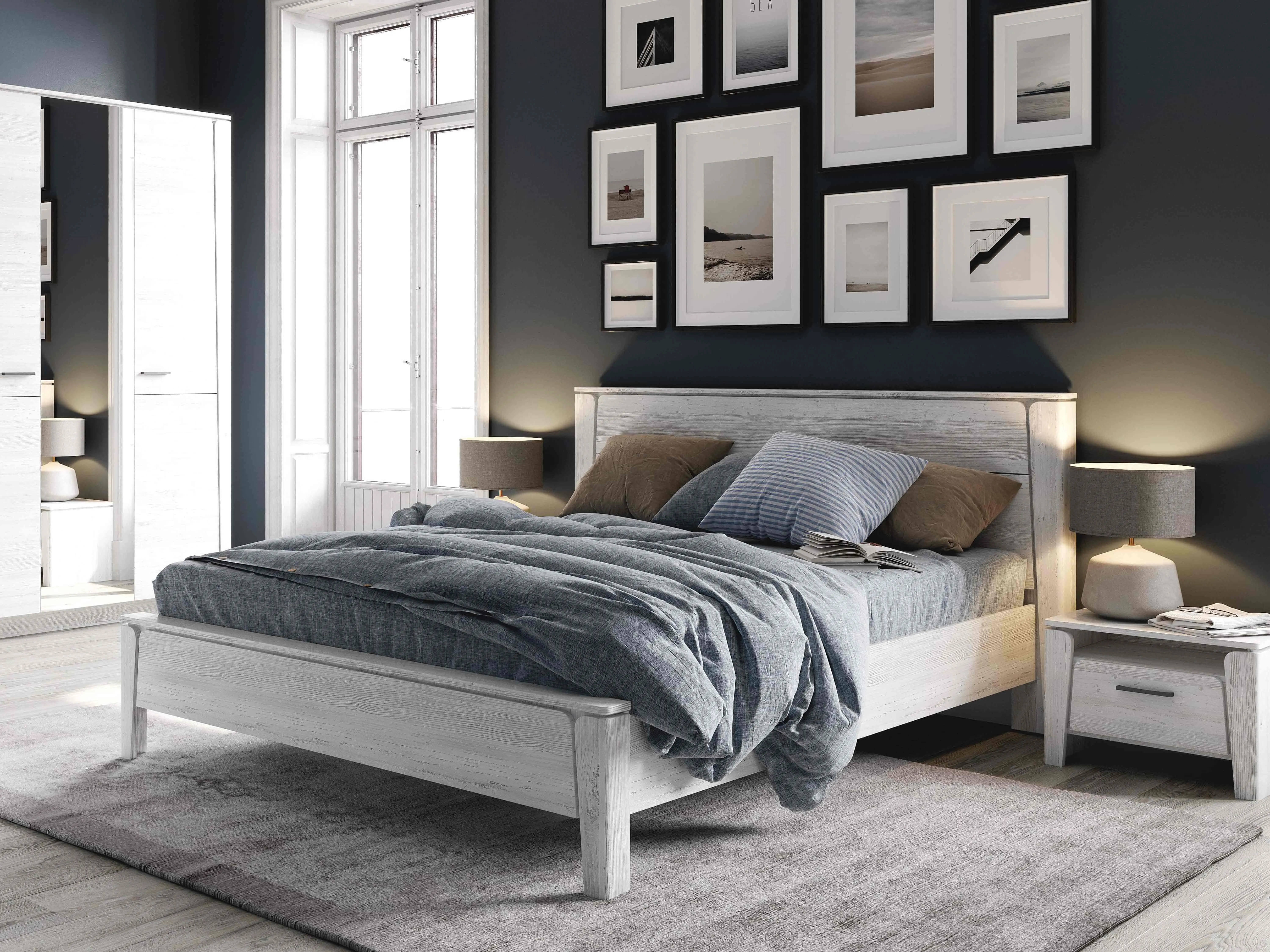 В состав гарнитура входят различные элементы, которые позволят вам создать уютную спальню, такие как: шкаф двухдверный, шкаф трёхдверный, туалетный столик, комод с тремя ящиками, тумба с ящиком, кровать.