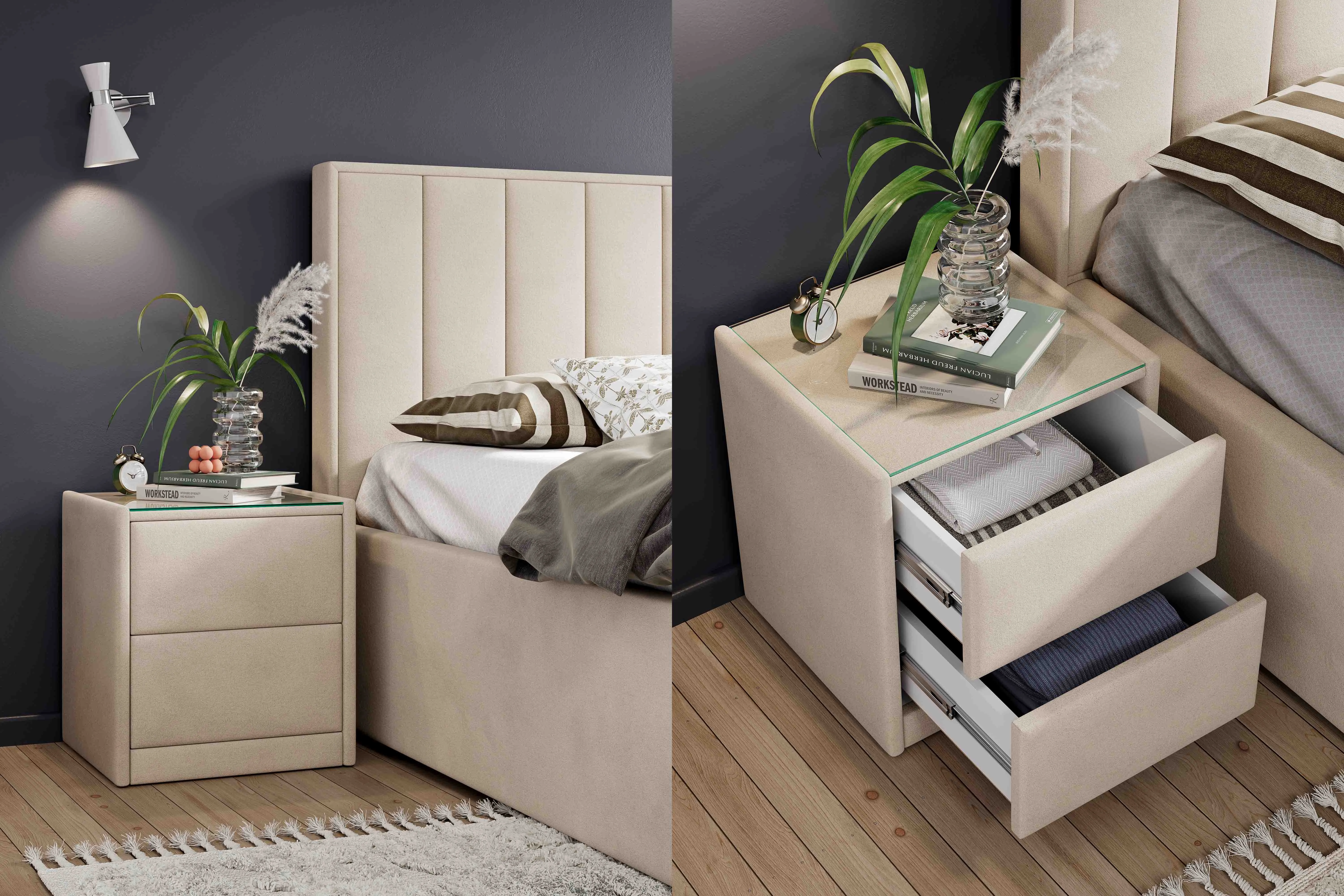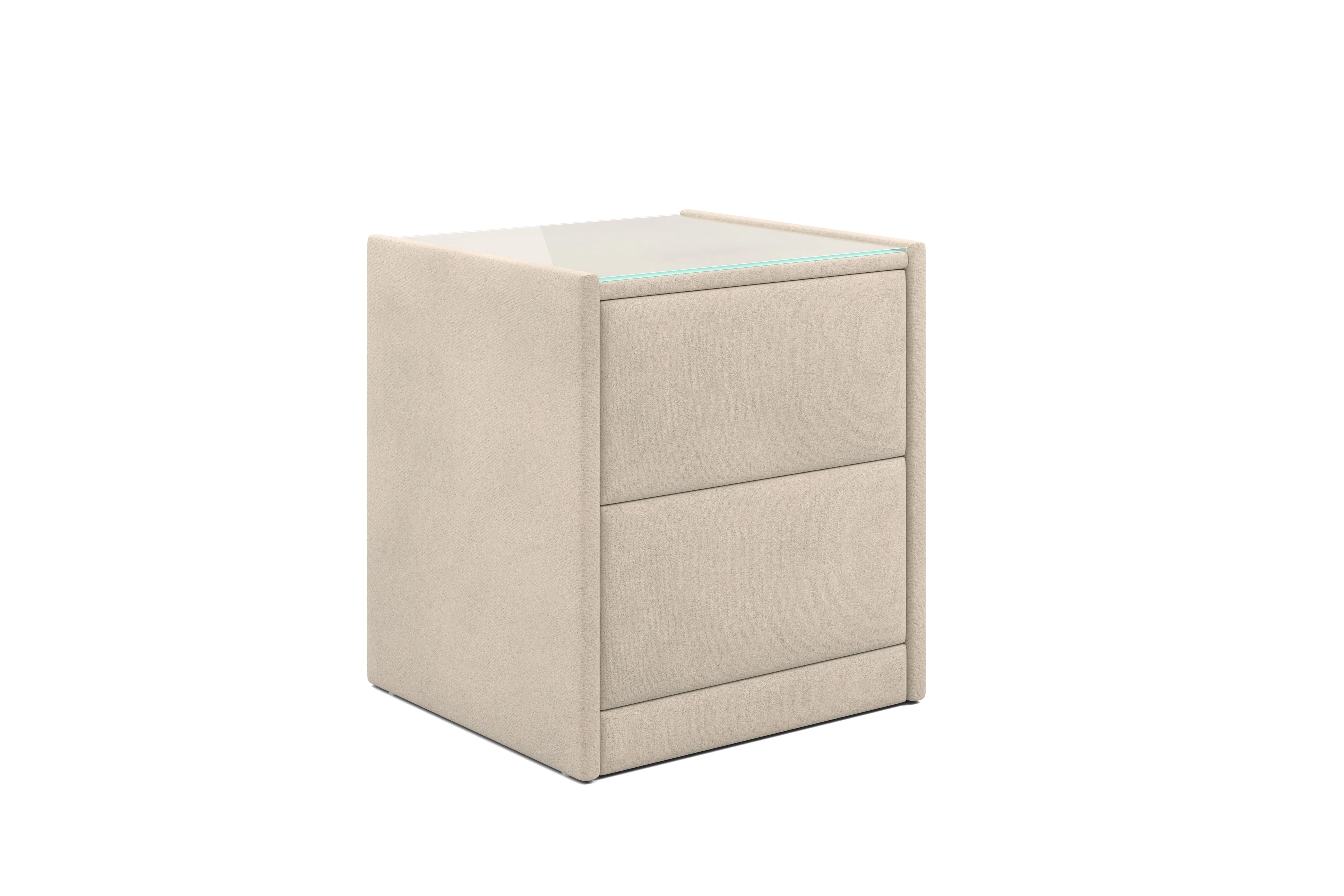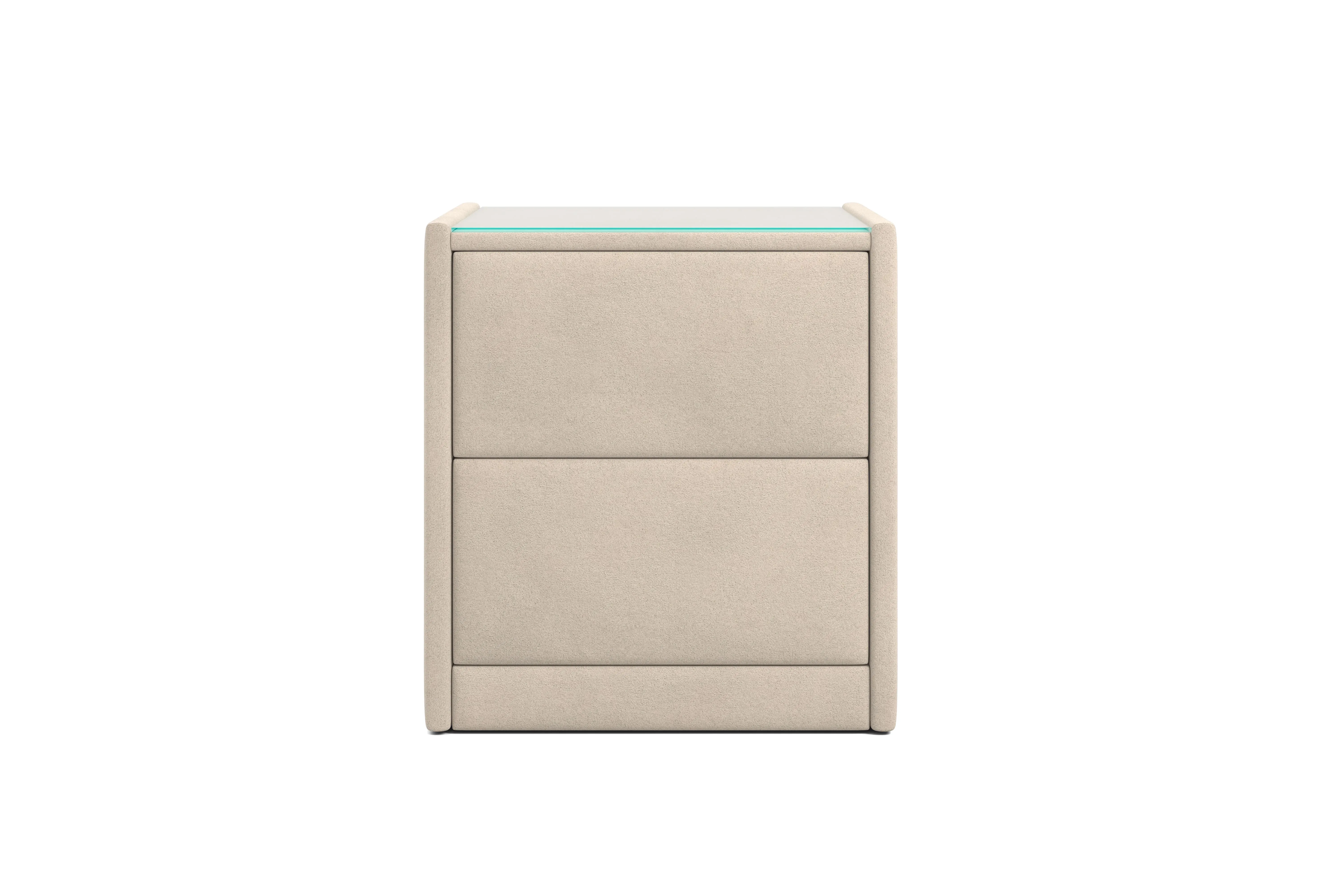 Тумба обтянута высококачественным велюром, что придает ей особый уют и комфорт. Имеет стеклянную столешницу и два вместительных выдвижных ящика с механизмом Push to open. Скругленные торцы модели, минимизируют риск удариться в темноте.