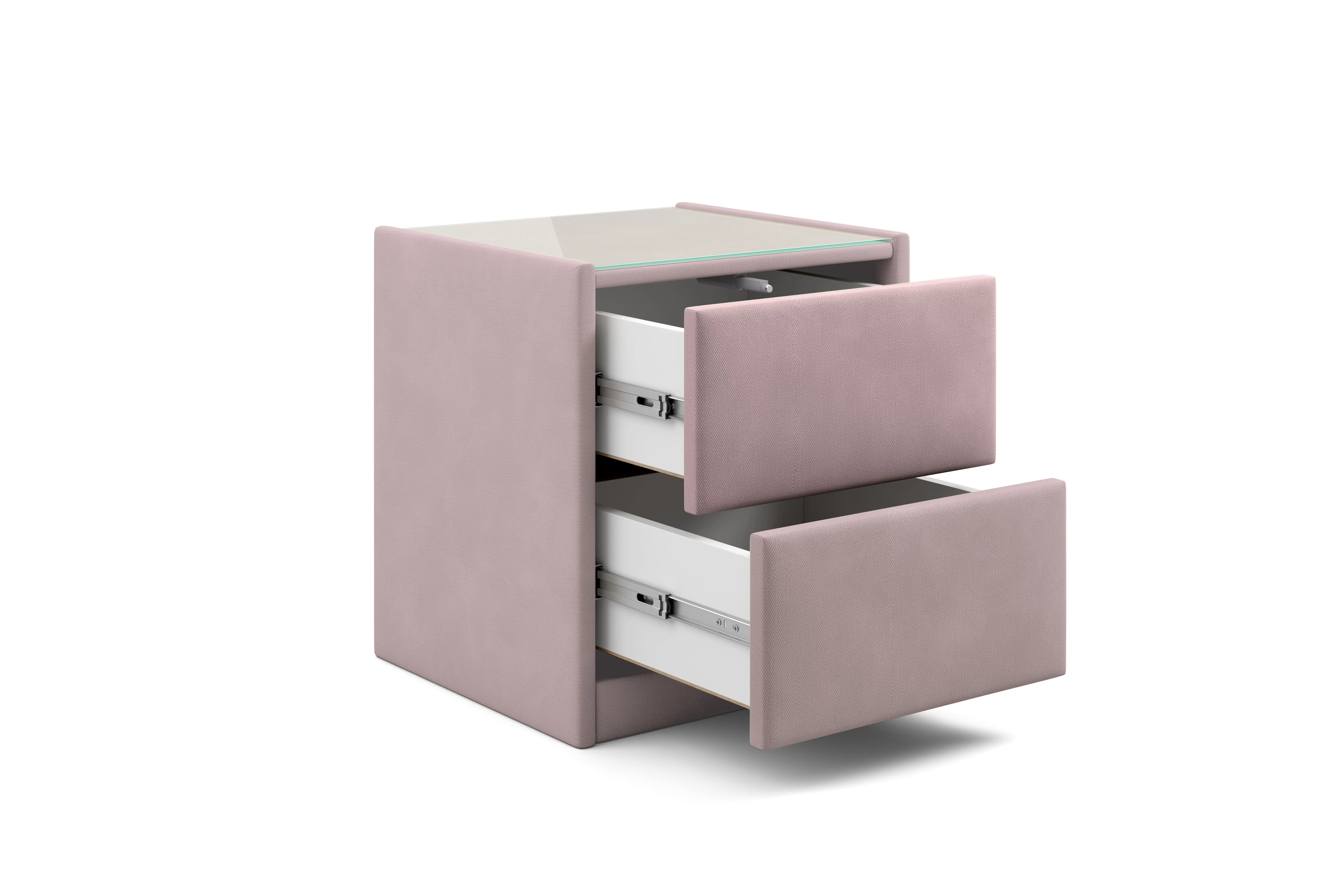 Тумба обтянута высококачественным велюром, что придает ей особый уют и комфорт. Имеет стеклянную столешницу и два вместительных выдвижных ящика с механизмом Push to open. Скругленные торцы модели, минимизируют риск удариться в темноте.