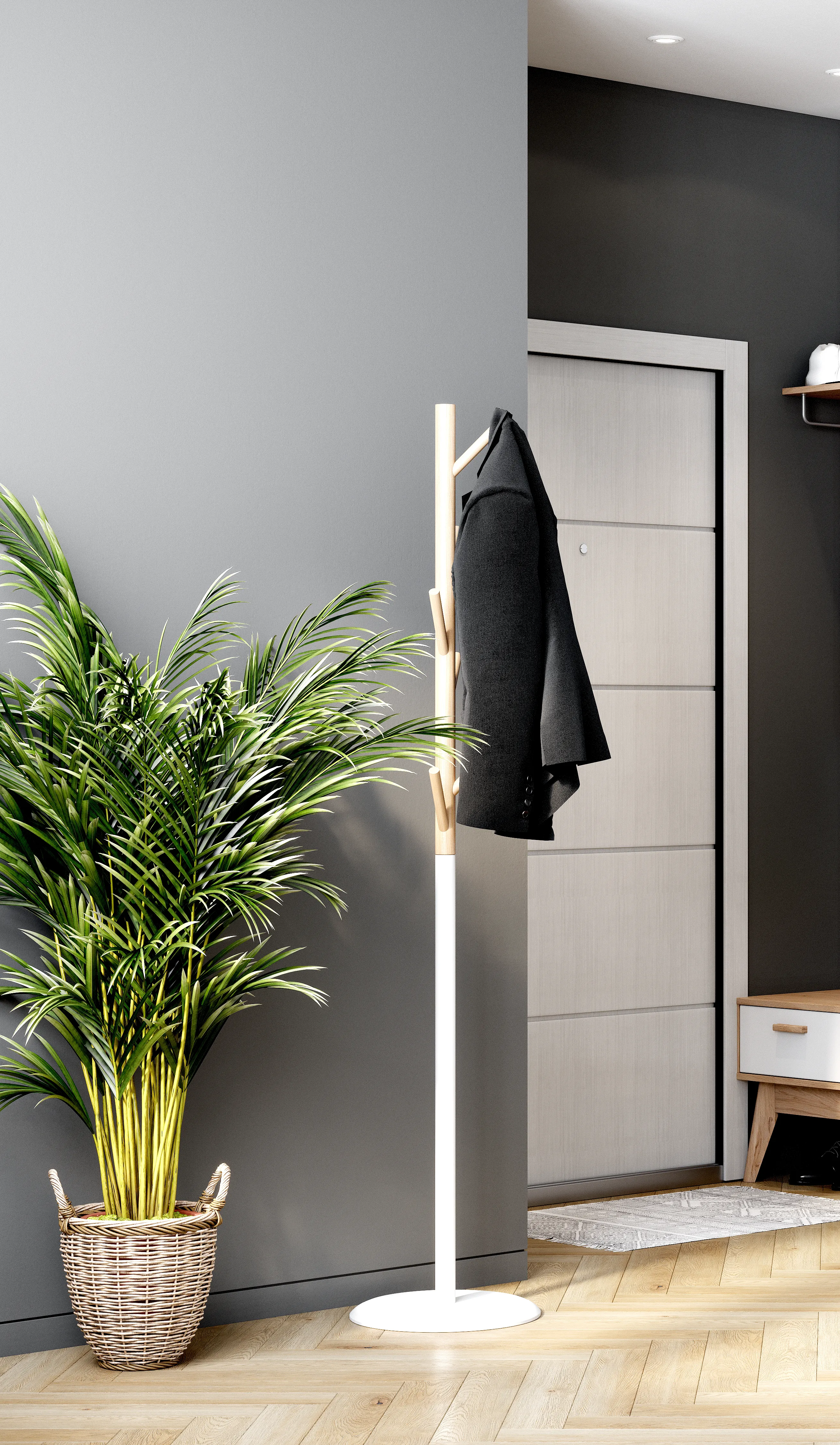 Вешалка представляет собой разборную конструкцию, которая состоит из основания МДФ 25 мм, в которое вставляется утяжелитель и с помощью шпильки М8 через металлическую трубу фиксируется деревянная опора с крючками, выполненная из массива березы. Масса утяжелителя 4 кг.